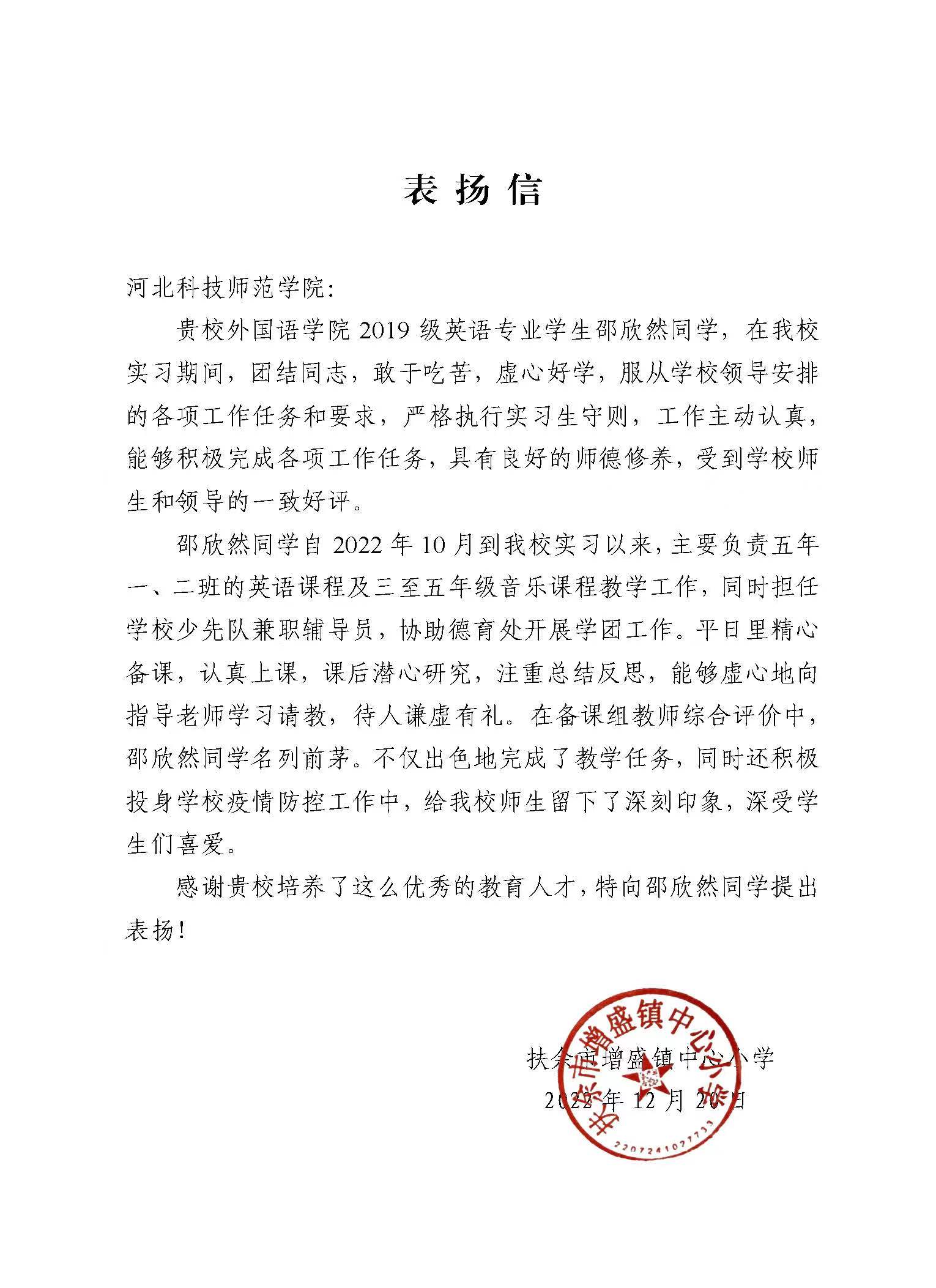 近日,吉林省扶余市增盛镇中心小学向我校发来表扬信,感谢我院英语专业邵欣然同学在该校出色地完成顶岗实习任务。