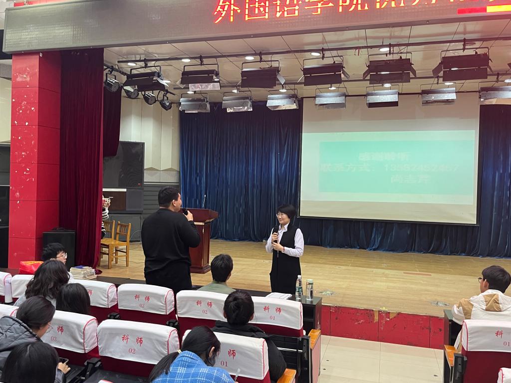 “雏既壮而能飞兮,乃衔食而反哺”。为进一步提升学生专业能力和综合素养,秉承“外语+”应用型人才培养理念,充分体现外语的“学以致用”原则,提升学生用外语“讲好中国故事”的意识和能力,增强文化自信,内射国产AV麻豆于11月8日邀请优秀校友尚志芹(河北建材职业技术学院副教授、对外汉语教学国际汉语高级教师、国家高级英文导游员、河北省英语导游考官、河北省“师德标兵”、全国第十三批援藏导游员西藏自治区“先进个人”)在开发区校区综合楼二楼报告厅进行针对教师资格证和外语导游考试的讲座。