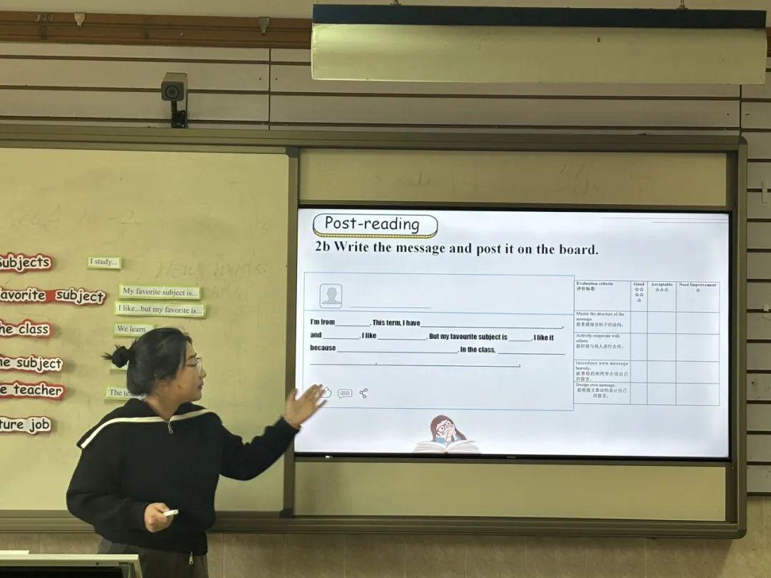 杨晔老师授课内容是七年级上册Unit4 Section B What can you learn from different subjects?杨老师的阅读课以巧猜课程表活动为导入,激发了学生们的学习兴趣,贴近日常的课程话题,让学生们更具有表达欲。读前、读中、读后的逐级主题活动设计,以及对文本的深入剖析,让学生们对课程有了更深刻的理解和个性化的评价。