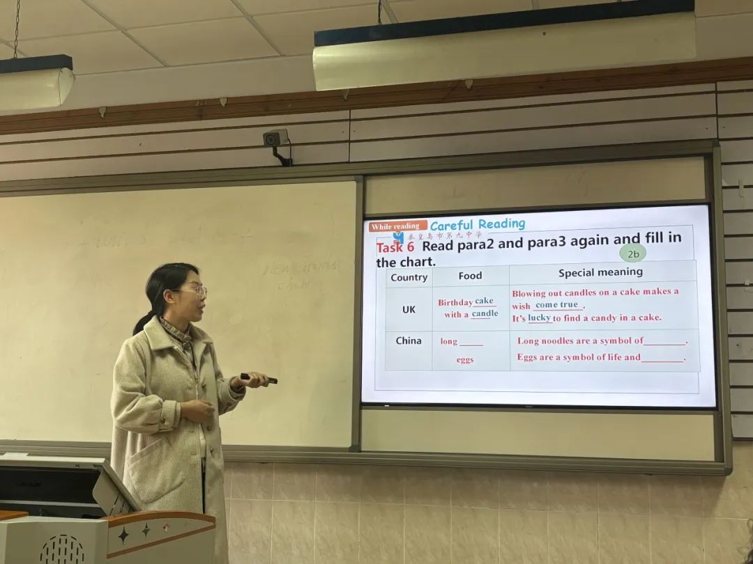 陈晓老师授课内容是七年级下册Unit 10 Section B Birthday food around the world。陈老师的阅读课以生日视频为导入,向同学们展示生日的主题元素。预测、略读、精读等阅读技巧的综合使用,训练了学生们的阅读能力,同时,陈老师还对语篇进行了结构化地分析,这无疑对学生的写作具有实操性的指导作用。