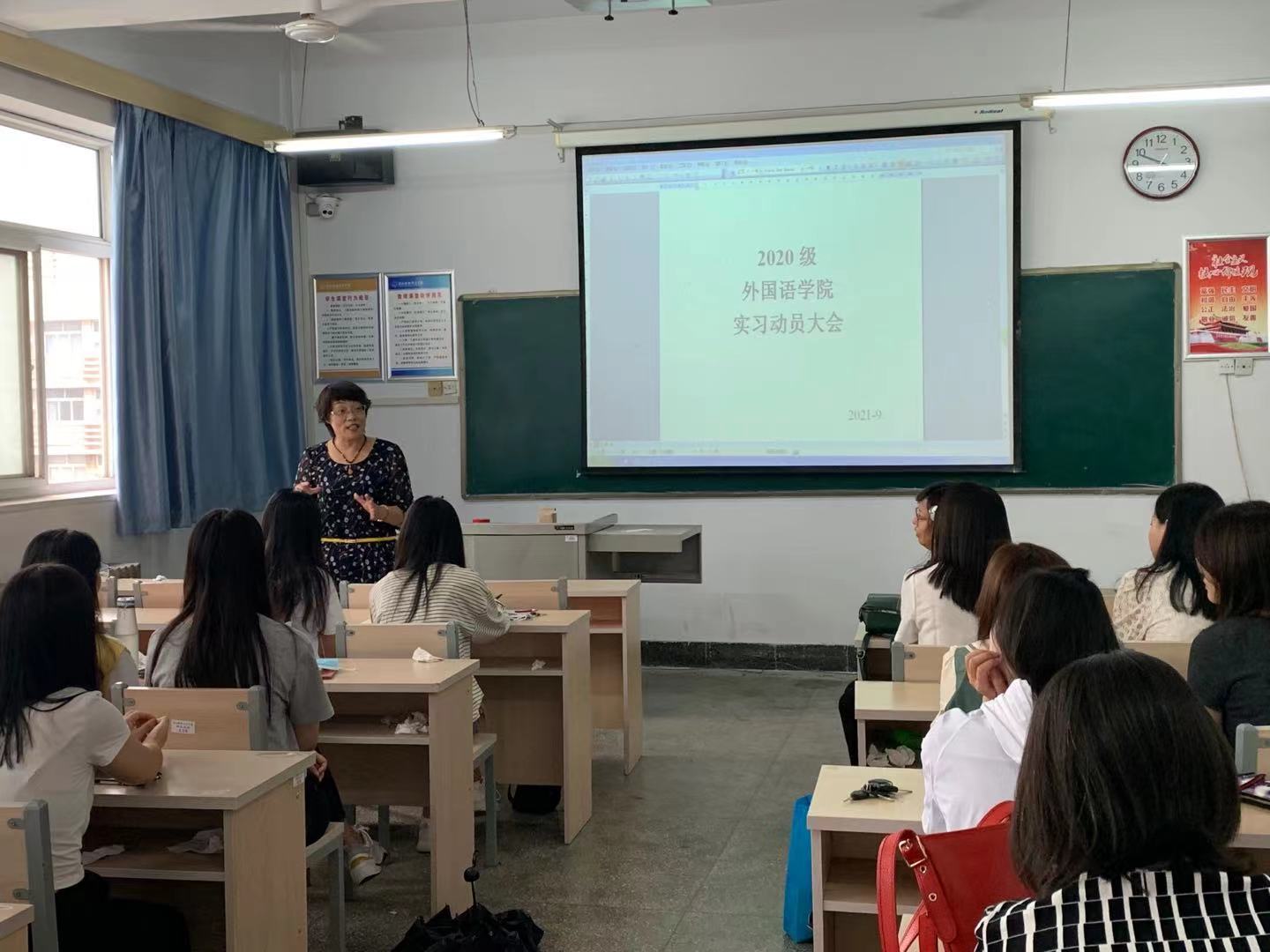 9月6日外语学院在秦皇岛校区召开“2020级硕士研究生实习动员大会”,崔海英院长、范学荣院长、罗学锋院长参会并发言,紧抓三习管理,强调实习纪律。教学部主任刘晓冰主持会议,2020级学科教学(英语)专业全体学生参会,与会人员还有导师王静、孙秋月及研究生秘书张新月老师。