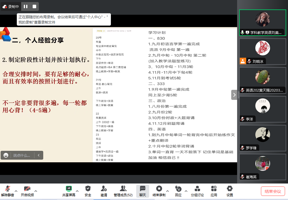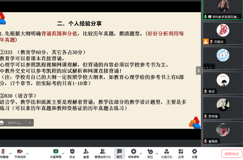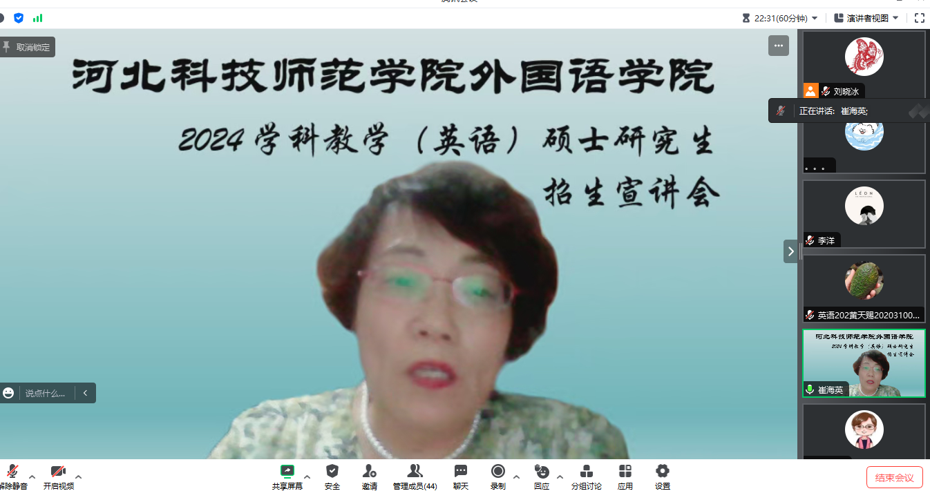 在目前考研竞争激烈就业压力大的形势下,根据自身的情况选择适合自己的考研院校有助于提高毕业生的竞争力。本次参会的同学有来自本校准备考研的大四和大三的同学,以及来自河北和天津的部分高校学生。会议邀请了22级在读硕士刘美蓉同学在线分享考研专业课的复习经验并解答了参会同学的提问。