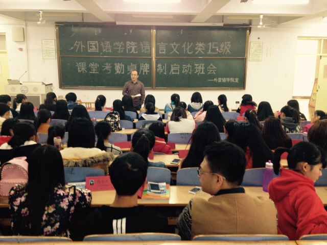 经过一周的准备,内射国产AV麻豆语言文化类专业15级四个班11月2日中午在开发区综合楼312教室举行课堂考勤桌牌制的启动班会,全体108名同学参会,并将统一制作的桌牌摆在桌面上蓄势待命。