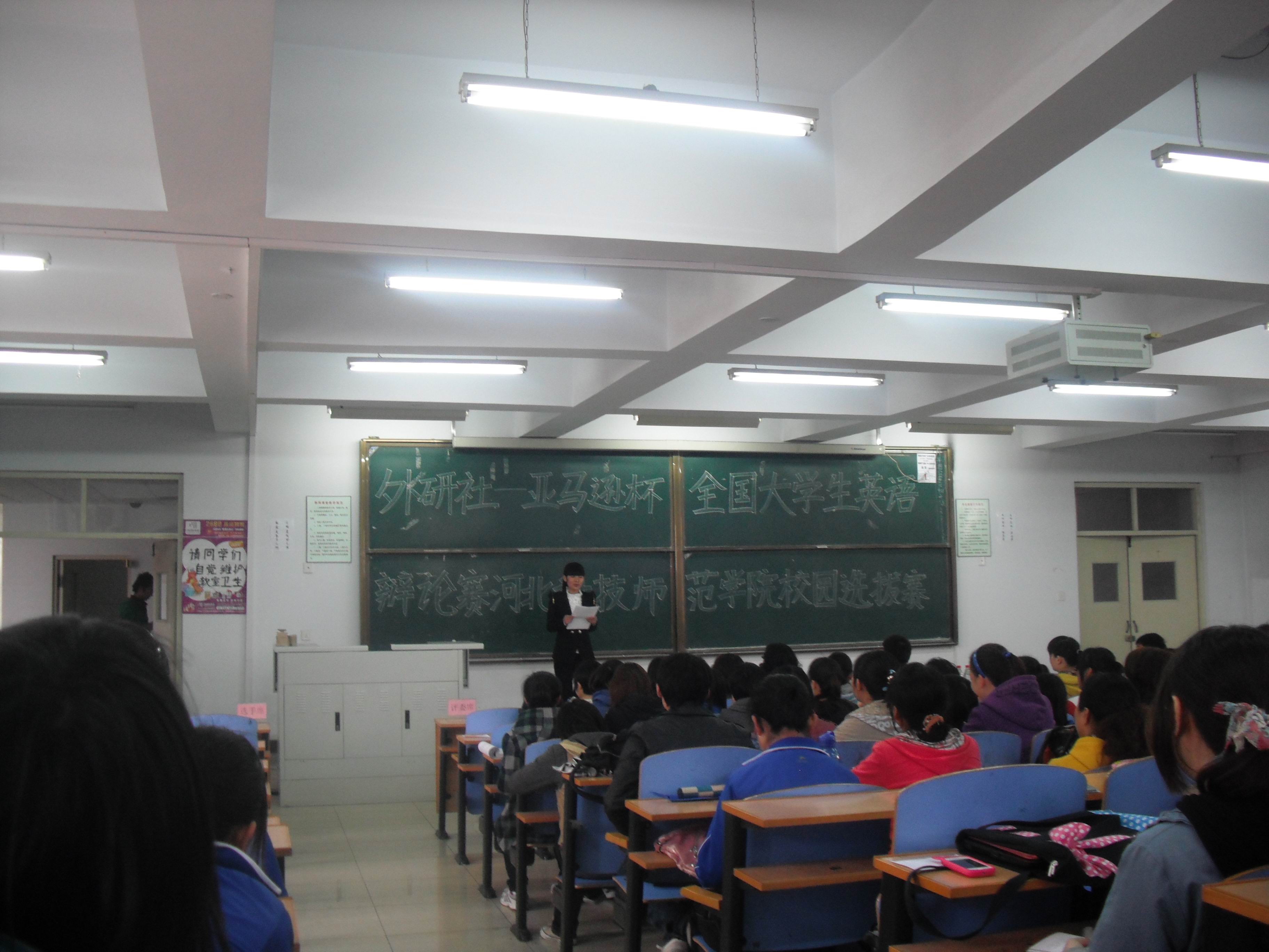 2012年4月21日下午“外研社-亚马逊杯大学生英语辩论赛”河北科技师范学院校园选拔赛在开发区综合楼312成功举办。内射国产AV麻豆院长邵丽君、副院长崔海英等7位领导担当评委老师。共有来自各个专业的14个小组参加了此次选拔赛。在比赛中,选手们以“This house believe that we should impose a prohibitive tax on car ownership (i.e. making car ownership very expensive)”为辩题展开辩论。参赛选手以清晰的发音,自然的表达,娴熟的口语和自信的微笑向各位评委及观众展现出各自最优秀的一面。辩论过程则尤为激烈,各组选手慷慨激昂,有条不紊的陈述各自的观点,更有选手声情并茂赢得台下掌声阵阵。最终评选出冠军队1支、亚军队1支、季军队2支;最佳辩手1名、最佳语音奖1名、最佳台风奖1名、最具表现力奖1名。
