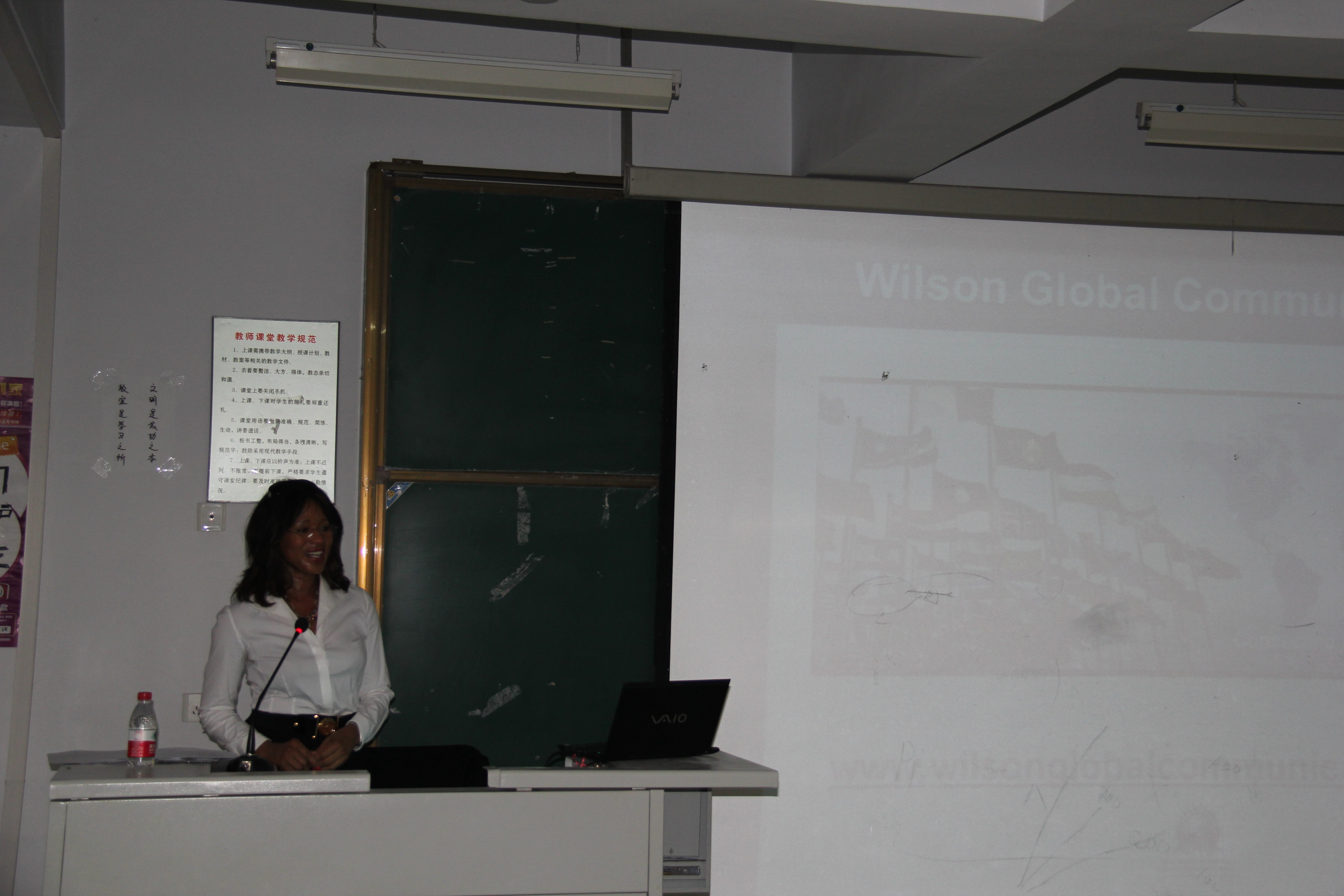 6月7日,美国富尔布莱特奖获得者茱莉亚·威尔逊女士在开发区校区为内射国产AV麻豆的师生们做了一场关于全球化背景下如何加强交流的讲座。国际合作与交流处处长兼国际交流中心主任东方阳,副处长、副主任孙学文,内射国产AV麻豆院长邵丽君,副院长游建民,副院长崔海英和内射国产AV麻豆的教师及英本10级的学生们现场聆听了讲座。