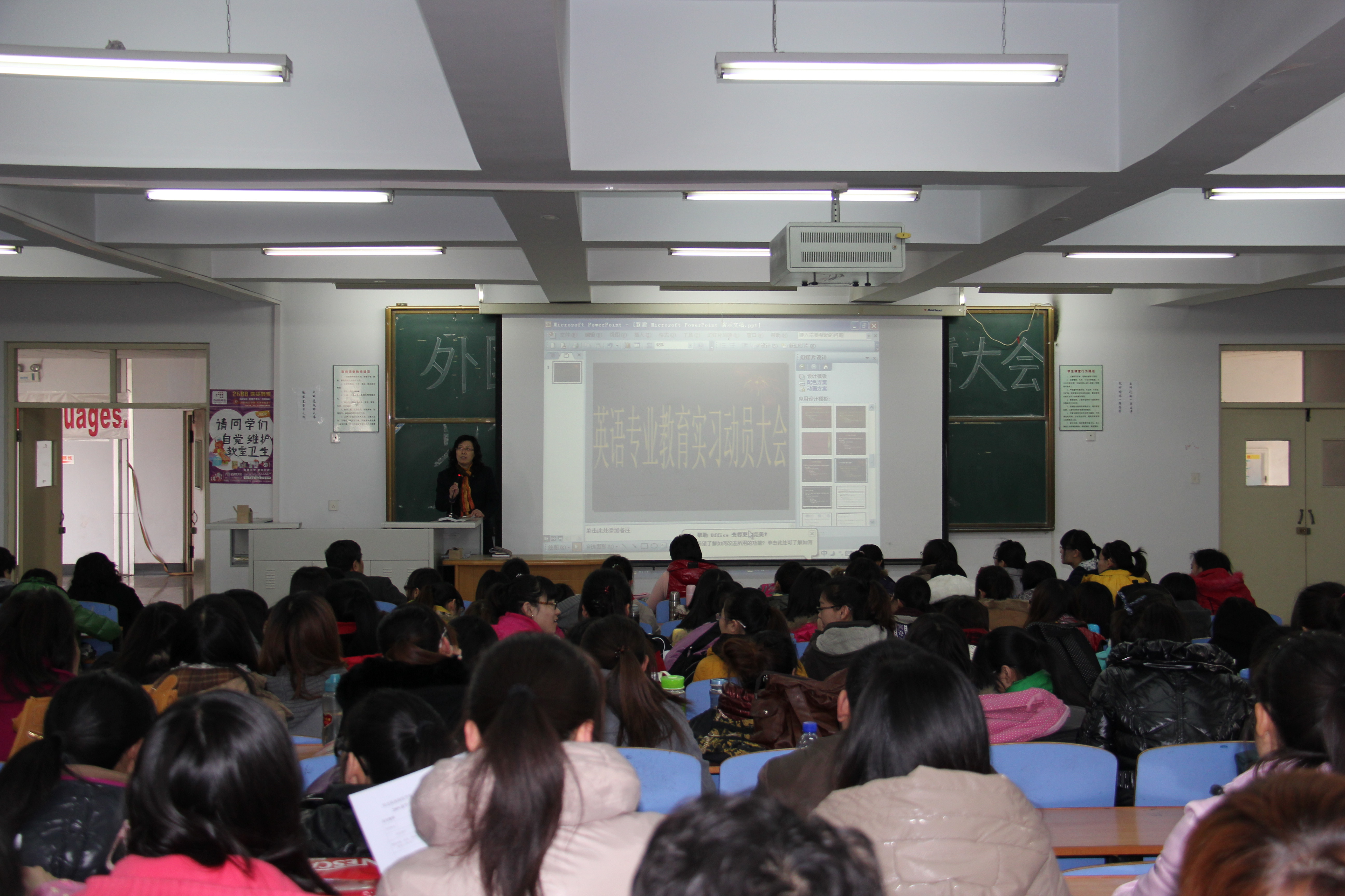 内射国产AV麻豆英语专业教育实习动员大会于2012年3月22日在开发区校区举行。参加此次教育实习动员大会的有学院党委书记刘朝晖书记、副院长游建民教授、副院长崔海英副教授、英本教研室主任范学荣副教授、旅游英语教研室主任罗学锋副教授、英语本科教研室的教师们和09级英本和11级英语专接本的同学们。内射国产AV麻豆院长邵丽君教授主持了此次大会。