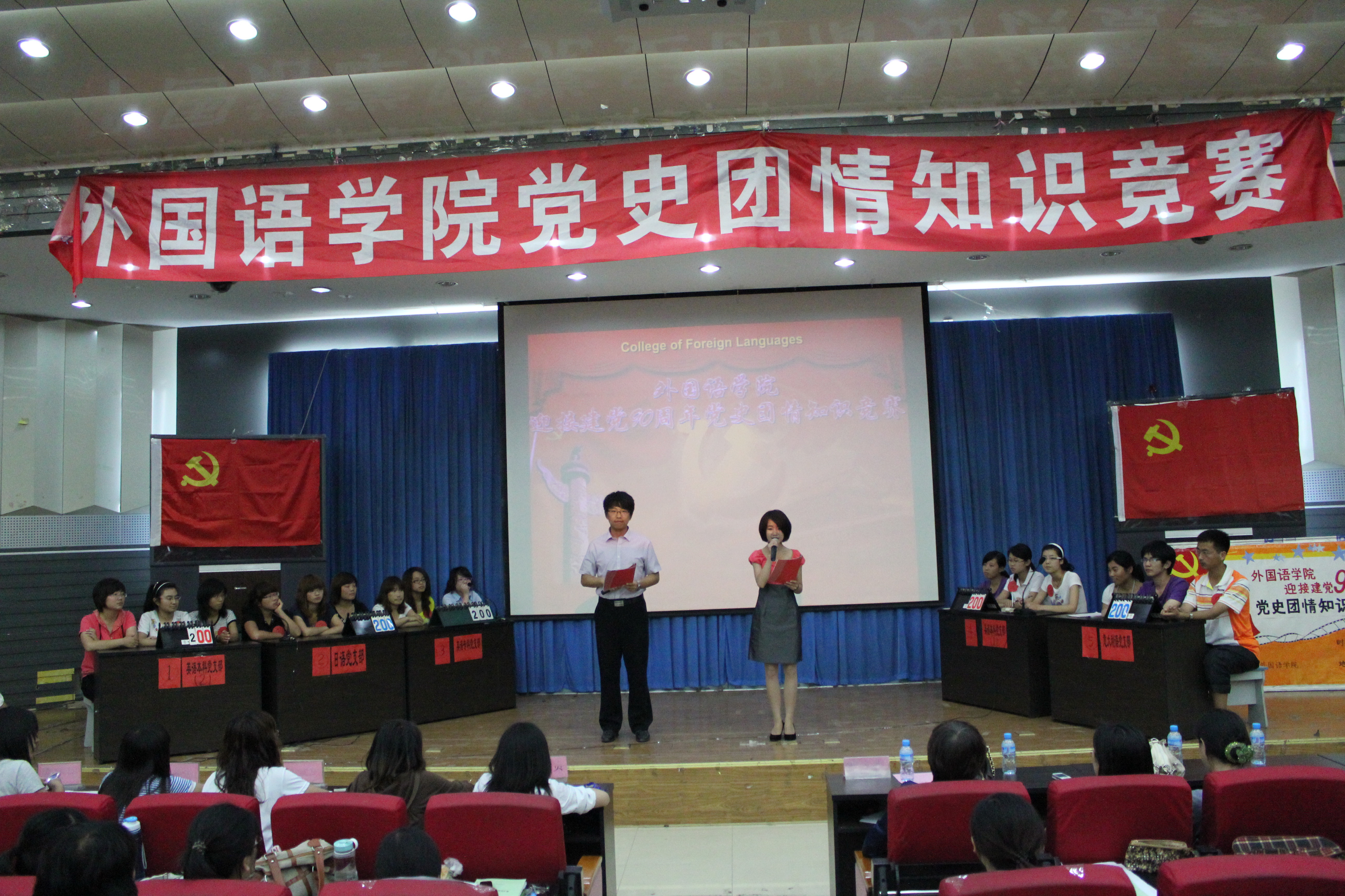为迎接建党90周年的到来,重温党的光辉历程,讴歌党的伟大业绩,在全校学生党员和入党积极分子中掀起爱党、爱国、爱社会主义的热潮,内射国产AV麻豆于6月8日晚在开发区二楼学术报告厅举行了“迎接建党90周年‘党史团情’知识竞赛”。出席活动的领导和评委有内射国产AV麻豆党委副书记、副院长宋文华老师、学院办公室主任李聪文老师、院团委书记李一尘老师以及各学生党支部书记,2011年内射国产AV麻豆入党积极分子党校学习班的全体成员观看了比赛。