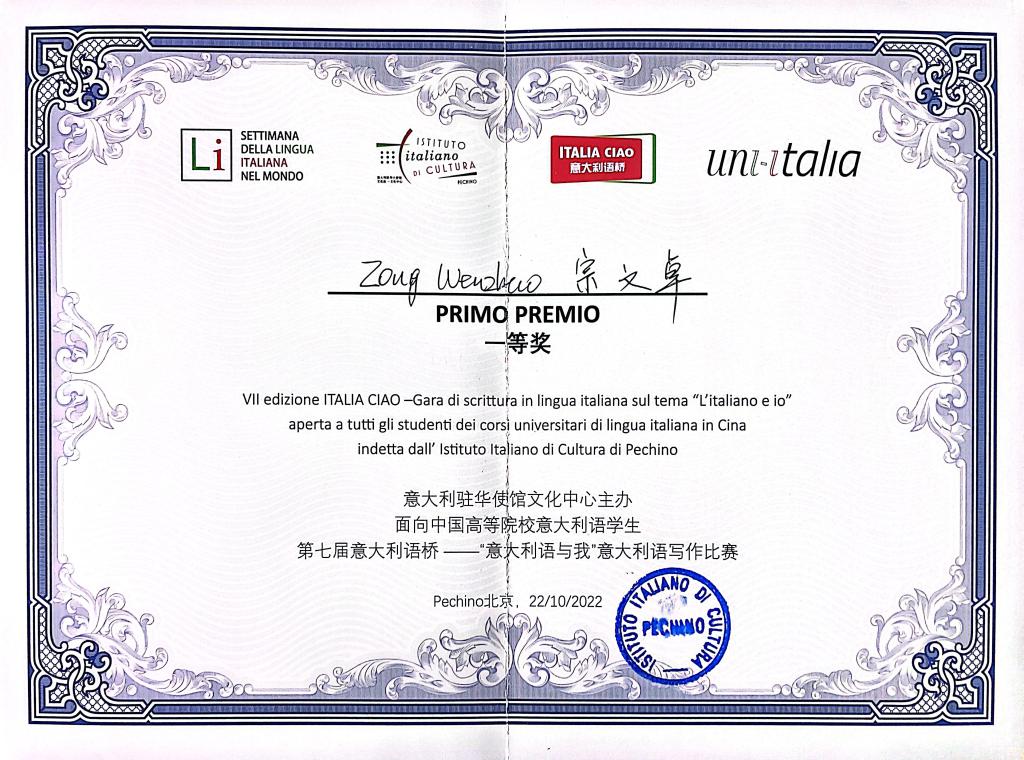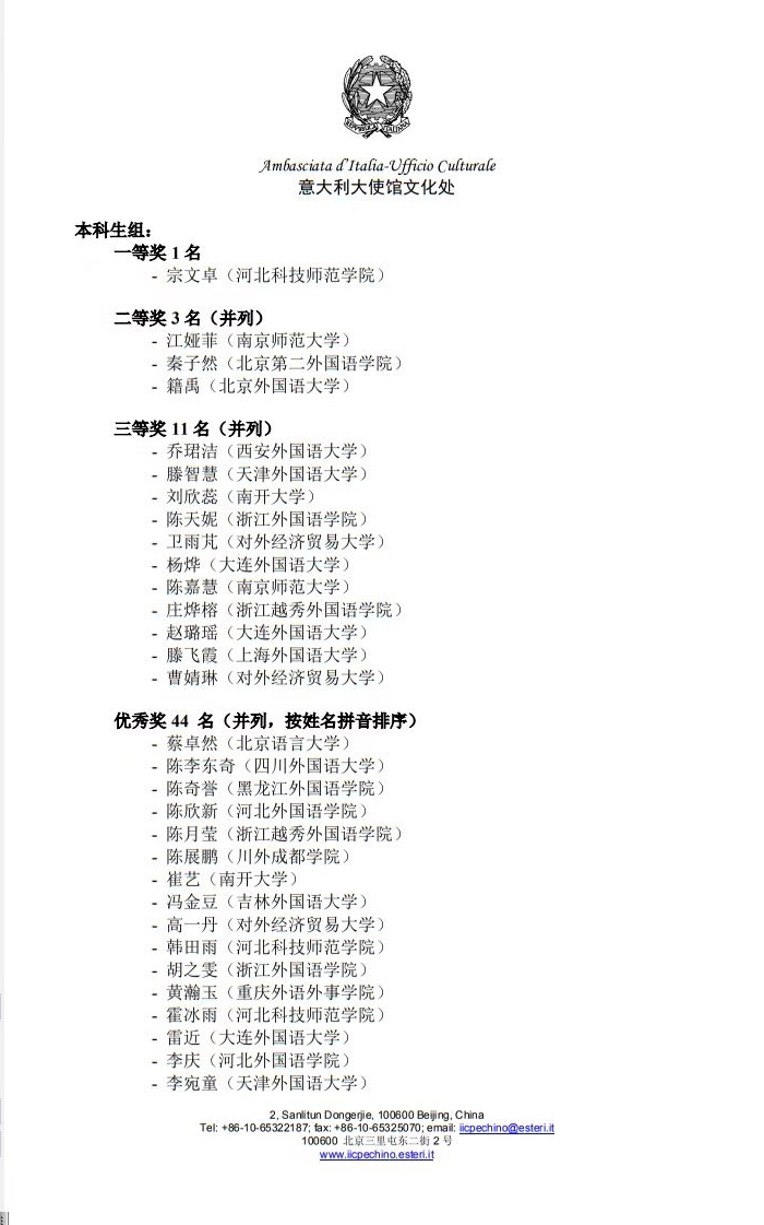 全国“ITALIA CIAO/意大利语桥”大赛由意大利驻华使馆文化处主办,每年以不同的主题、不同的形式进行,是专门面向全国高等院校意大利语专业学生进行的意大利语竞赛,也是全国意大利语专业学子们最重要的学习和交流的平台。本次比赛获奖彰显了我校意大利语专业的办学实力和教学质量,为我校赢得了良好的社会声誉。