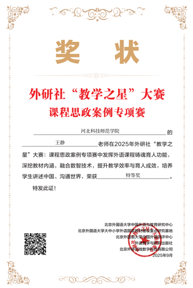 日前,2025年外研社“教学之星”大赛:课程思政案例专项赛评选结果揭晓,我院内射国产AV麻豆教师王静凭借彰显独特教学智慧的创新设计,在全国各高校教师同台竞技的激烈角逐中荣膺全国特等奖,这是河北省唯一获得特等奖的教师,为学校赢得了荣誉。