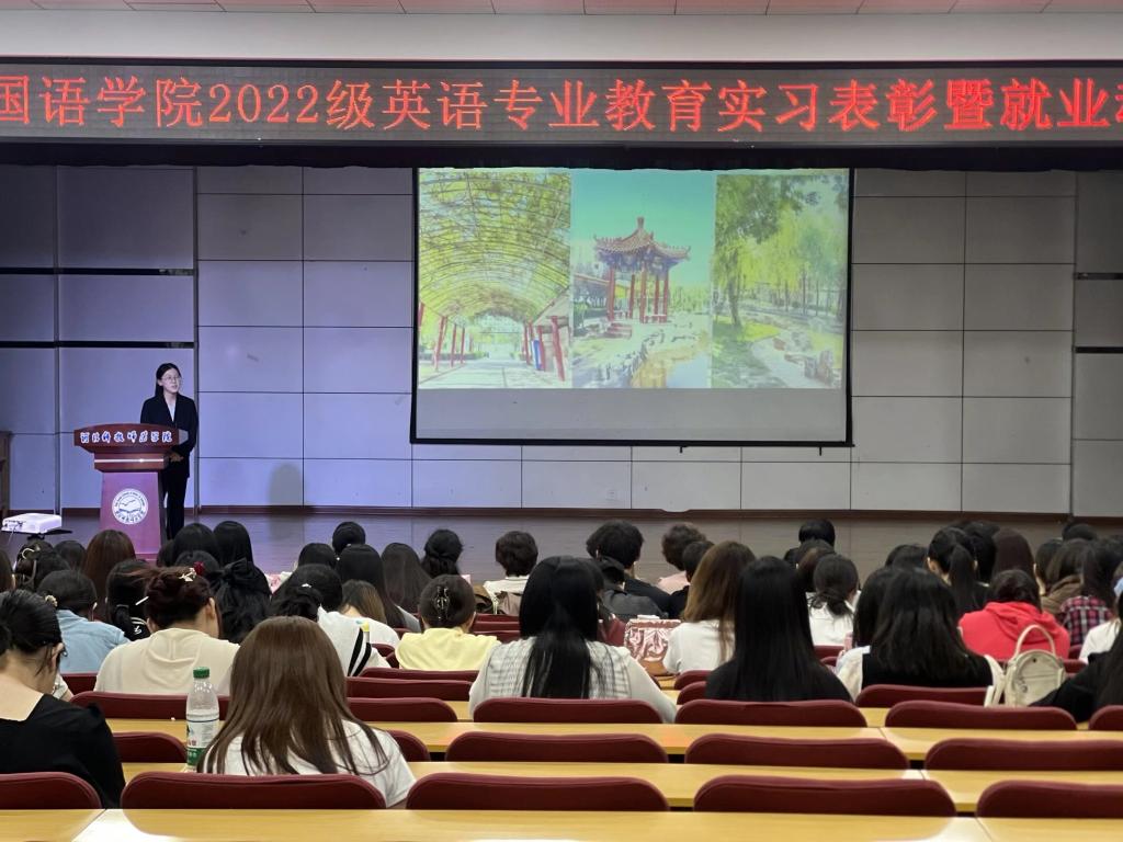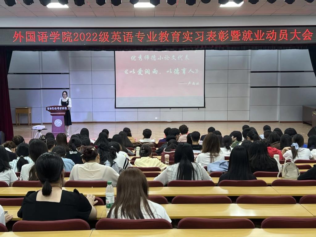 2025年9月25日,内射国产AV麻豆英语专业教育实习表彰暨就业动员大会在多功能厅圆满召开,该专业2022级全体同学以及部分2023级学生参加了大会。此次大会全面回顾了上个学期的教育实习成果,表彰了在实习期间表现优异的同学,为师生提供了分享经验、交流心得的平台,并对大家今后的就业指明了方向,进一步推动了师范生培养质量的提升。